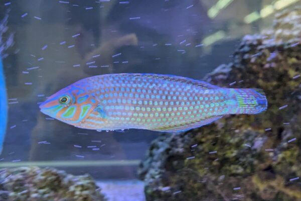 雄、雌、幼魚で姿が変わっており、幼魚は一転して茶色と線状の模様、雌は暗めのエメラルドグリーンの半模様、オスは半模様と、頭部に不規則ではっきりした模様を持っています。