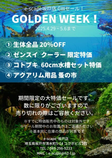 2026年4月29日~5月6日までGWセールを行います! ※本記事についてのお問い合わせはe-scape坂戸店 電話(049-298-5233)メール(e-scape@h2-l.jp)Twitter(https://twitter.com/e_scape_sakado)までお願いいたします